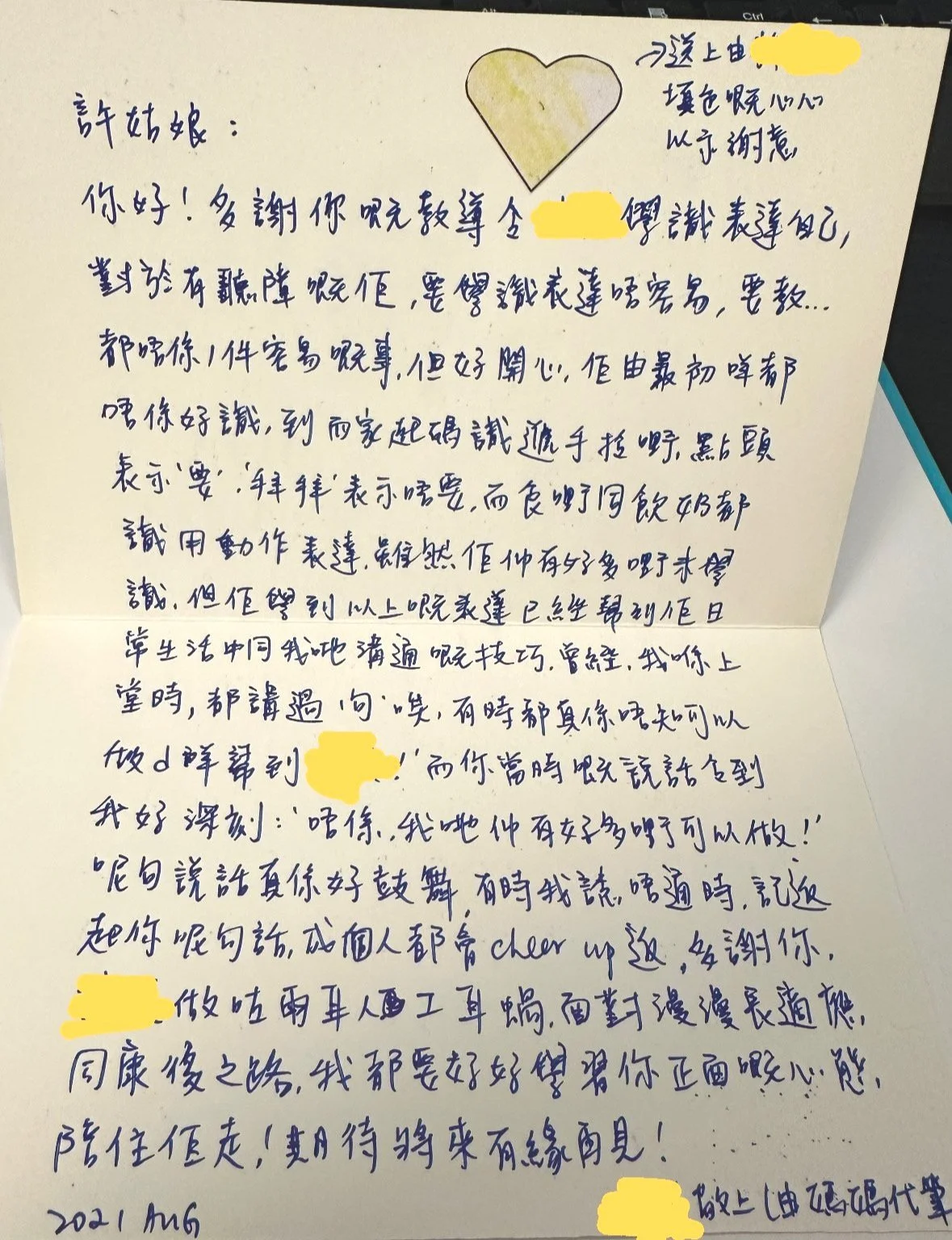 Hello! Thank you for teaching XXX to express herself. As a hearing-impaired child, it is not easy to learn to express herself, and it is not something that can be taught easily. But I am glad that she went from a child who did not know many things, to a child who can now reach out her hands for requests, nod her head for ‘yes’, wave bye-bye for ‘no’, and use gestures for ‘eat’ and ‘drink milk’. Although there are still many things she hasn’t learned yet, those non-verbal expressions have already helped a lot in our daily life and communicate with us. I remember that was a time when I was in your session, I said ‘Sometimes I really don’t know what can I do to help her’, but the words you said impressed me: ‘Not at all, there are many things we can do!’. Your words were very encouraging, sometimes when I get stuck I remind myself of your words, and then I become more cheerful. Thank you. XXX has completed her cochlear implant for 2 years, there is still a long way to adaptability and rehabilitation, I will learn from your positivity and walk with her. Hope to see you in the future!